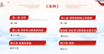 陈苗苗同志领学《党史学习教育工作条例》的总体架构和具体内容。她表示,《党史学习教育工作条例》共六章、三十四条,总结了党史学习教育的宝贵经验,明确了四个方面的主要任务。我们应坚持学党史和悟思想相统一,把学习党的创新理论摆在党史学习教育的首要位置。