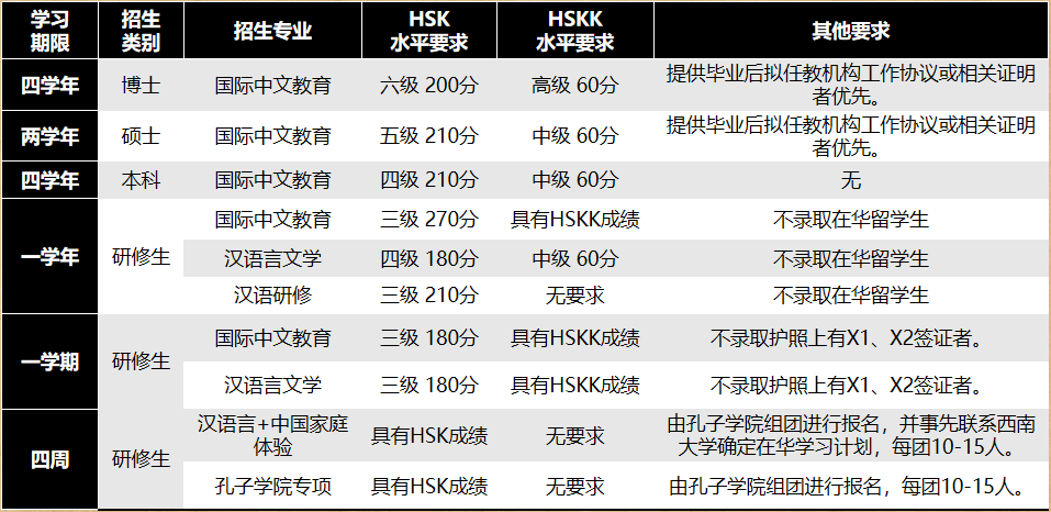 面向有合作意愿的孔子公司/课堂,以项目的方式招收一定数量的国际中文教育硕士生和国际中文教育本科生,录取要求同上。