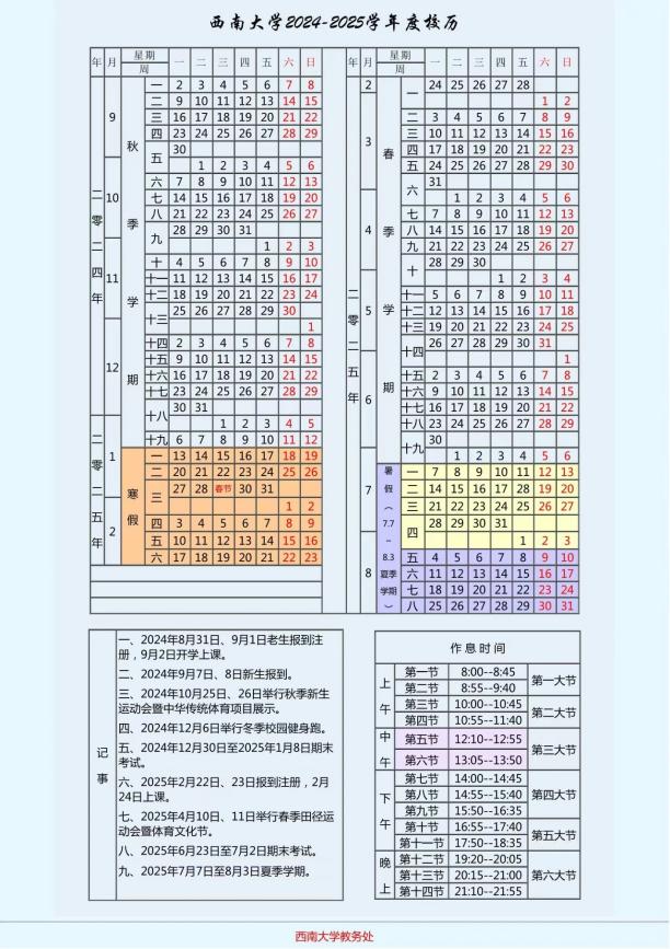 A new semester, a new starting point, and a new life await you. The International College has compiled a school calendar guide in both Chinese and English. This guide includes the 2024-2025 academic year calendar of Southwest University, important holidays and festivals of this semester, key event dates, and more. Hope this will assist you in making reasonable plans.